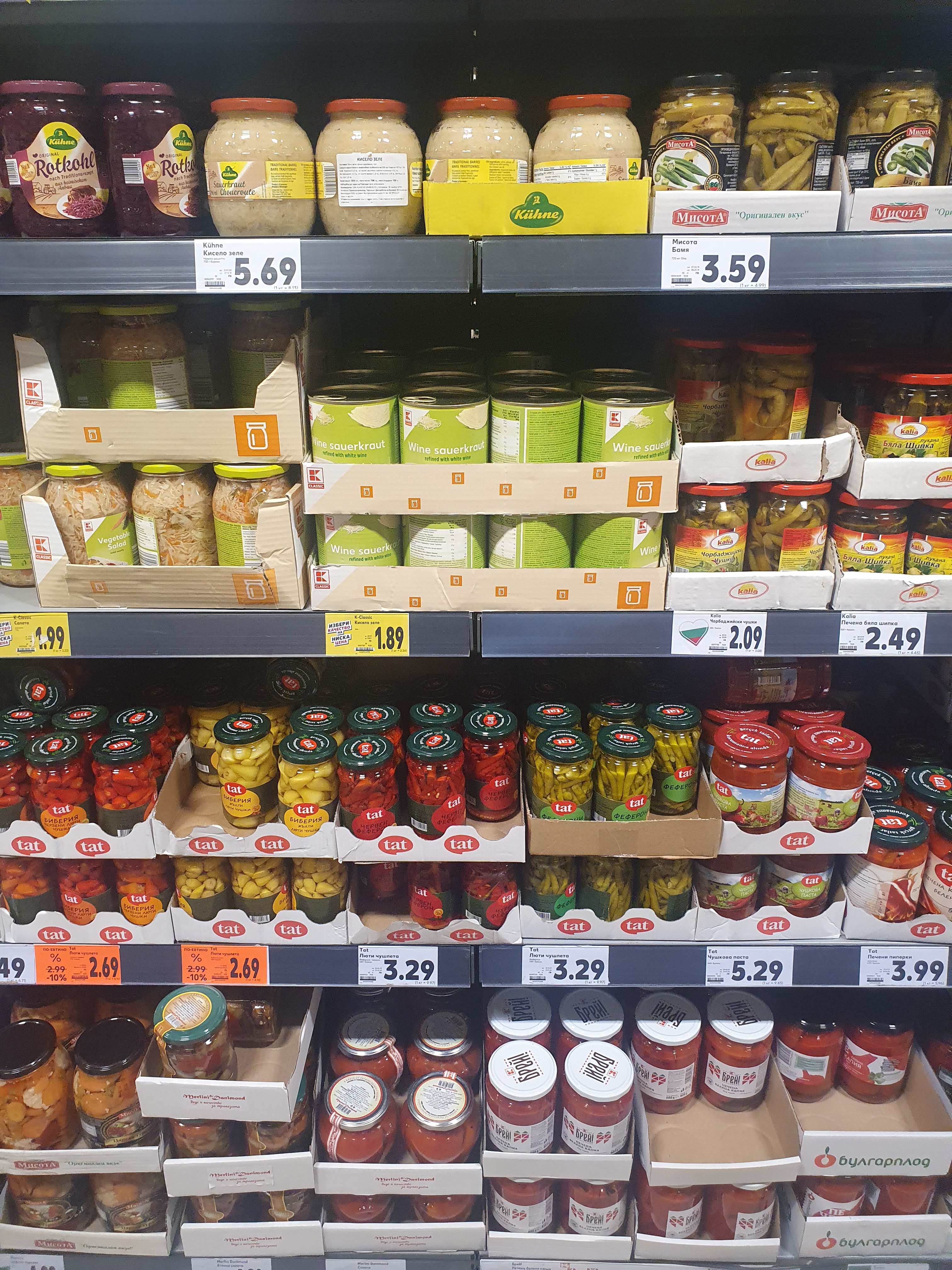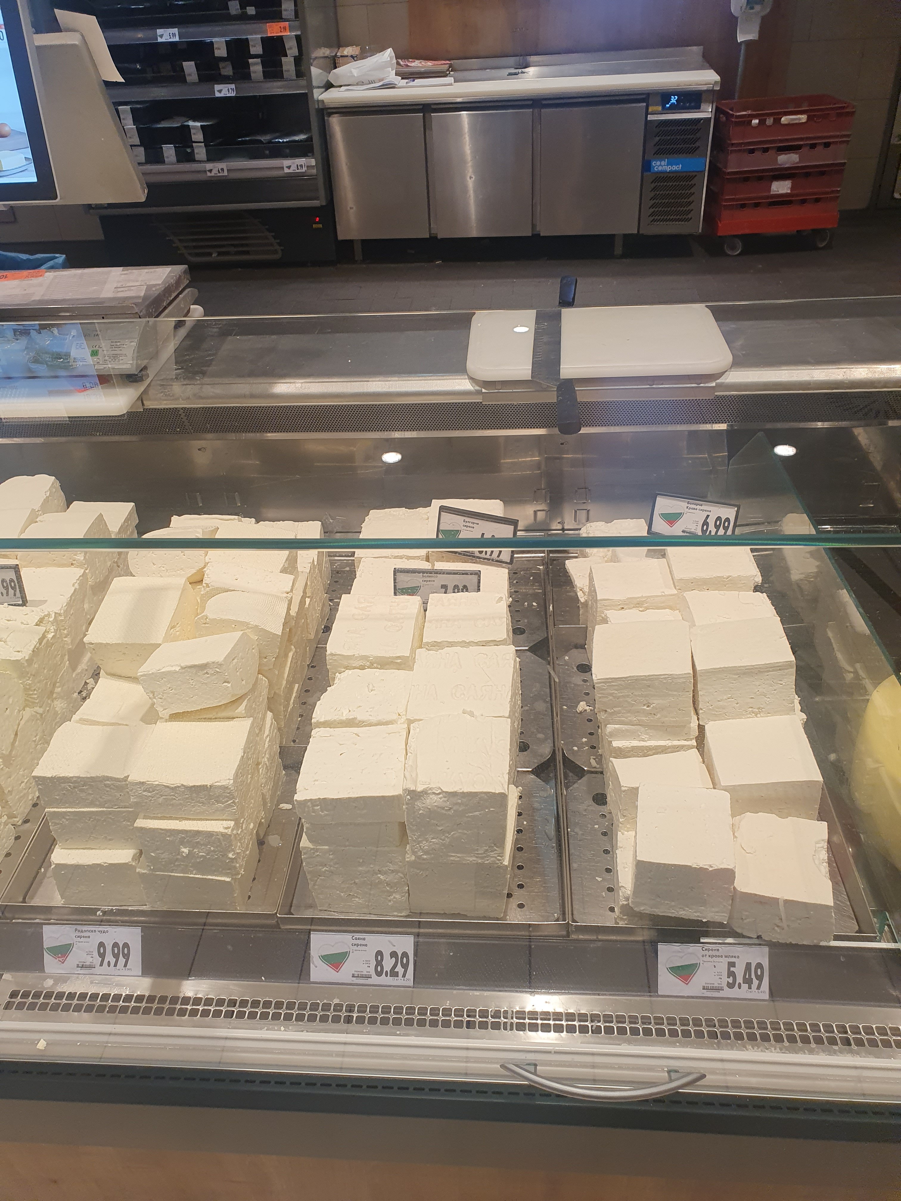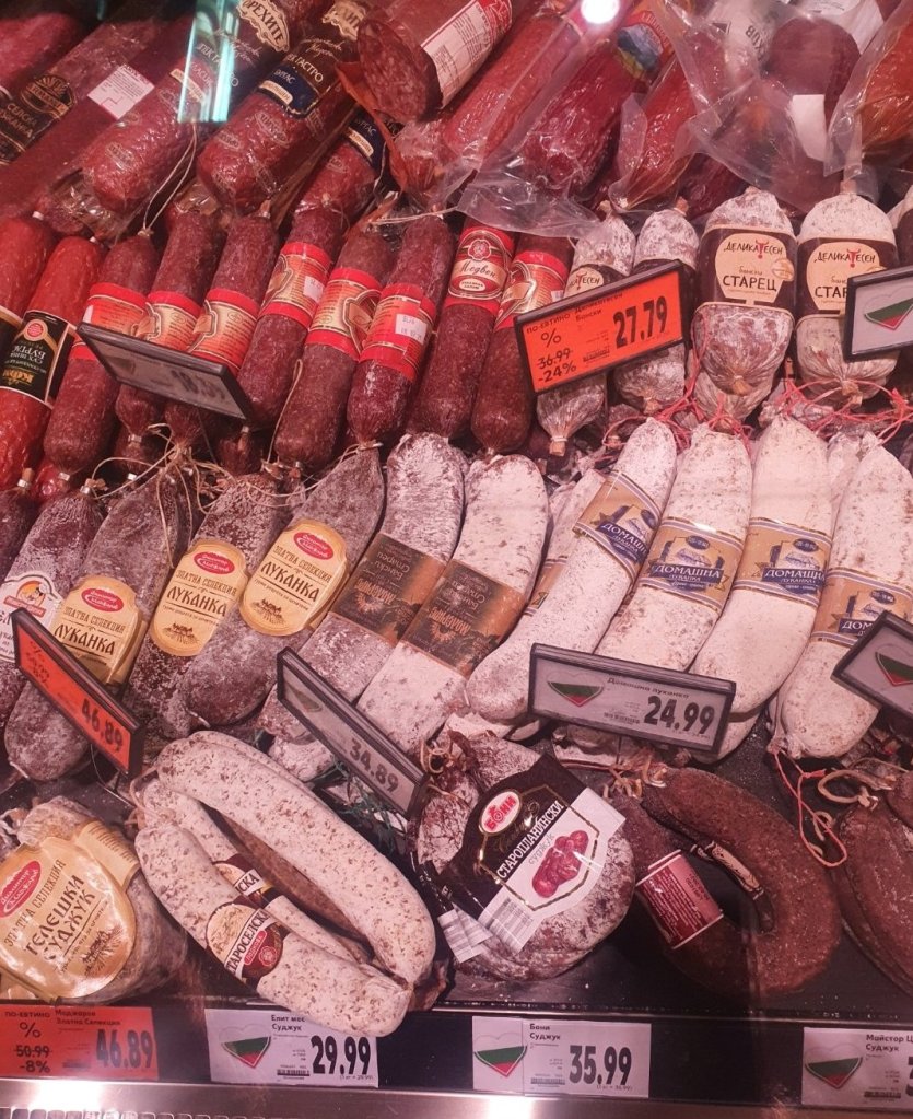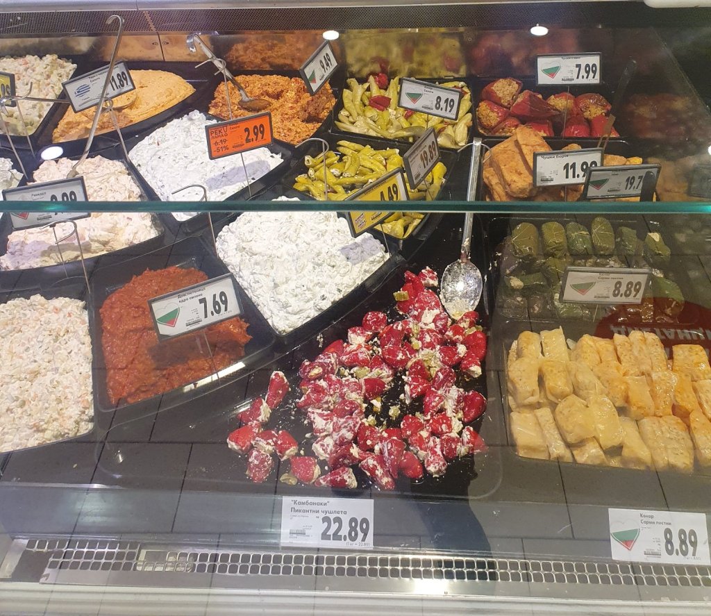 Yeşil , siyah zeytin ve lahana yeşil sarmayı kolaylıkla bulabilirsiniz. Bulgaristan iklimi zeytin üretmeye elverişli değil Zeytin nasıl bu kadar ucuz olabilir diye soruyorsunuz.HumusKaşkaval (kaşar) fiyatları onlarda da pahalı .Peynir (sirene) genelde 5 ve 15 leva arasındaSirene beyaz peynir Peynir dükkanları da vardı.Lutenista kahvaltımın olmazı gibi bir şeySürmelik çikolata tercih ediyorsanız pek benlik değil.250 ml vişne meyve suyuKöfte olarak dana, domuz ve karışık bulabilirsiniz.Bu Türkiye de kolayca göremeyeceğiniz bir şey, metro da bu şekilde bulabilirsiniz tavuk gibi .Makarna fiyatlarıLeshta, Nenkoyla bir tencere dolusu leshta (yeşil mercimek) yapıp altını yakmıştık yine de 3 gün evi tok tuttu .NohutBake Rolls atıştırmalıklarını seviyorumBoza ve ayran onların kültüründe de var.Rus salatasıBulgaristan baharatlarıylada ünlü , ben eve bir çok baharat karışımı getirdim.Bitki çaylarıAhmad tea denen şey burada çok ünlü.Hurma bile var