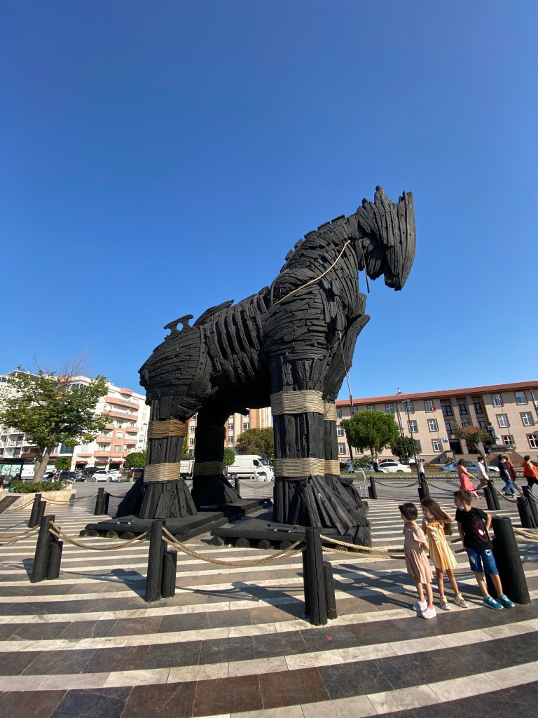 “Truva atı, Odysseus’un (Akhalılar) Truva surlarını aşmak ve şehre (Troya’ya) gizlice girmek için yaptırdığı tahtadan at maketi. Savaş yaklaşık 10 yıldır sürmüştür. Askerler bıkkın ve yorgundur. Zekası yüzünden Athena tarafından da sevilen Odysseus’un aklına tahtadan bir at yapma fikri gelir. Plana göre Akhalılar savaştan çekiliyor gibi gözüküp, geride çok büyük bir tahta at bırakırlar. Odysseus ve diğer seçkin komutanlar atın içine gizlenirken, diğerleri denize açılıp gemileri Bozcaada’nın arkasına, Troyalıların onları göremeyeceği bir şekilde gizlerler.