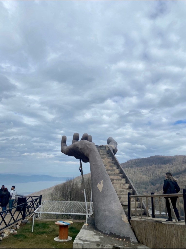 Kartepe’ye çıkan dağ yolunda sol tarafta Yamaç Cafenin içerisinde bulunuyor, kişi başı 30 Tl istiyorlar fotoğraf için drone kaldırıyorlar ve profesyonel makine ile de çekiyorlar bir sürü insan sıradaydı , bize bu yüzden ilgi çekici gelmedi ama değişik duruyor. Dünya’nın en büyük gökyüzü eli diye yazıyor ama bu bilginin doğruluğundan baya şüphem var.