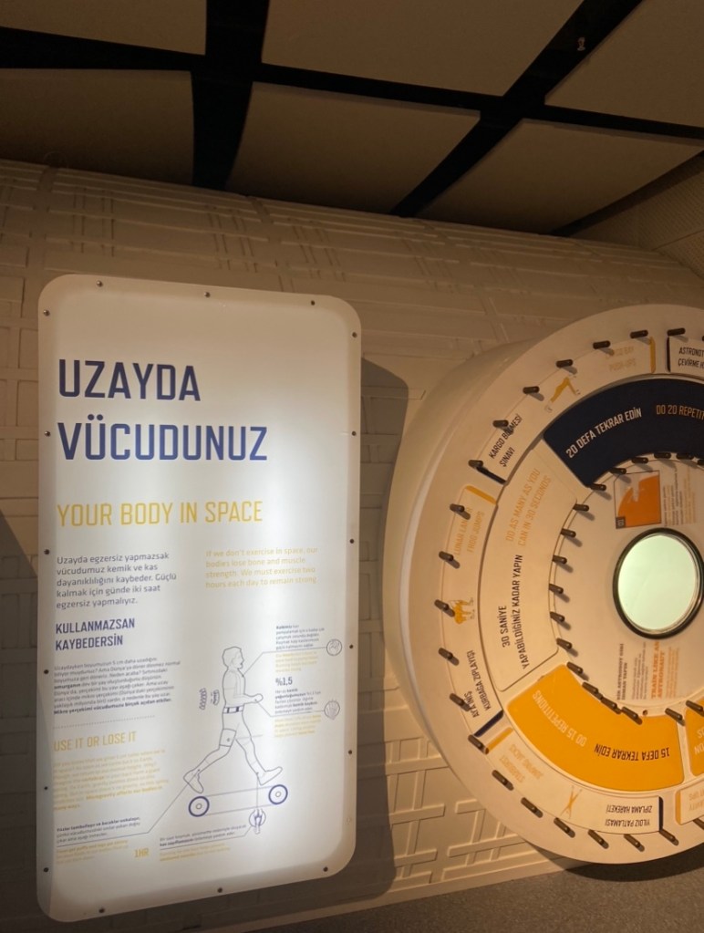 - Uzay istasyonunda yaşam : uzayda egzersiz , spor yapmazsanız vücudunuz kemik ve kas dayanıklılığını kaybediyor güçlü kalmak için günde 2 saat egzersiz yapmak gerekiyormuş. Uzaydaki yer çekimi daha az olduğu için uzayda omurgamız bir yay gibi uzayıp boyumuz 5 cm daha uzun oluyormuş ama Dünya’ya döndüğünüz gibi normal durumuna dönüyormuş. Uzayda yüzümüz tombullaşıp bacaklarımız incelirmiş , çünkü vücudumuzdaki sıvı yerçekiminin etkisi azaldığından yukarı çıkıyormuş.